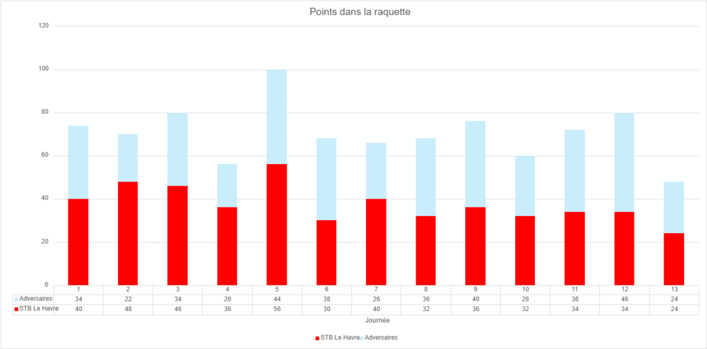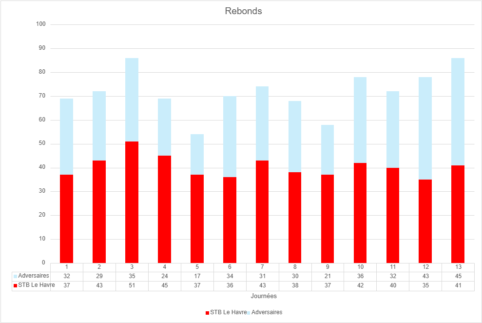 Malheureusement, et comme pour les rebonds, la tendance s’est inversée lors des 3 dernières journées. Les joueurs du STB n’ont pas pu installer leur jeu intérieur comme ils avaient l’habitude de le faire, leur moyenne tombant de 39 à 30 points par match. Et dans le même temps, les adversaires en ont marqué 6 de plus, passant de 30 à 36 ! Par exemple, Mulhouse avait survolé la raquette, y marquant 46 points contre 34