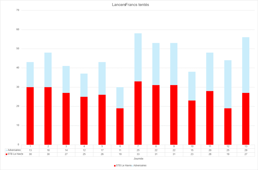 En moyenne, le STB Le Havre se rend 26,8 fois par match sur la ligne des lancers-francs (pour 19 réussites). Ces deux chiffres placent l’équipe en tête de toute la division pour cette statistique, juste devant Levallois, qui se trouve dans l’autre groupe. Cette statistique illustre là encore la volonté des Thomistes d’imposer un dur combat physique à leur adversaire chaque soir. De plus, ils n’en concèdent en moyenne que 18, ce qui les met dans la fourchette très basse de ce côté-là. Leur pourcentage moyen de réussite est très bon, 72,8, ce qui les met dans le top 5 de la division. Sachant que leurs adversaires ont un pourcentage équivalent, cela veut dire que le STB “part” avec un avantage (qu’ils construisent grâce à leurs qualités bien entendu) de 6 points.